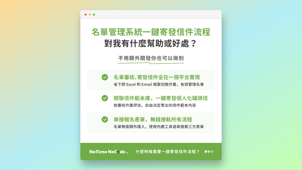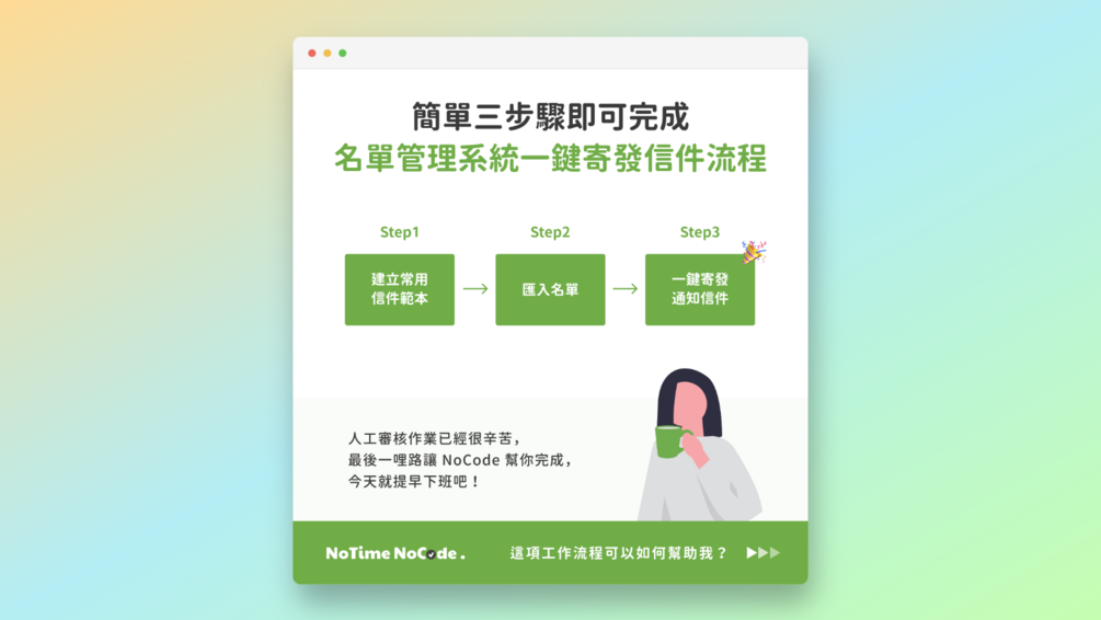 本數位產品為 NoTime NoCode IG (@notime_nocode) - NoCode 工作術 #006《專人審核與寄信作業必備工作術 - 輕鬆建立名單管理系統一鍵寄發通知信!》篇的進階流程模組範本,如果還沒看過那篇貼文的讀者,歡迎前往我們 IG 貼文查看唷~