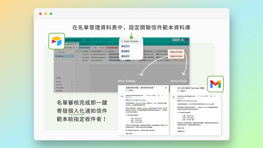 除了本篇的詳細步驟教學外,還包含「Airtable 的資料庫範本」一次提供給你!幫助你省下需要自己建立 Airtable 資料庫與欄位的時間,一鍵複製、匯入資料庫範本後,就可以馬上享受透過 Airtable 管理名單、一鍵寄發通知信的高效便利情境了!