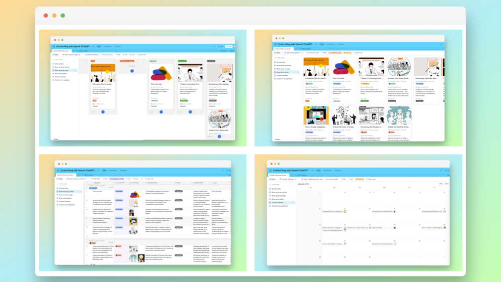 進階範本除了原有貼文的流程外,還額外加碼「Airtable 的資料庫範本,並包含不同風格樣式的管理介面」一次提供給你!幫助你省下需要自己建立 Airtable 資料庫與欄位的時間,一鍵匯入自動化流程及資料庫範本後,就可以馬上享受運用 ChatGPT AI 自動生成圖文並茂部落格內容,一鍵高效管理文章狀態的便利了!