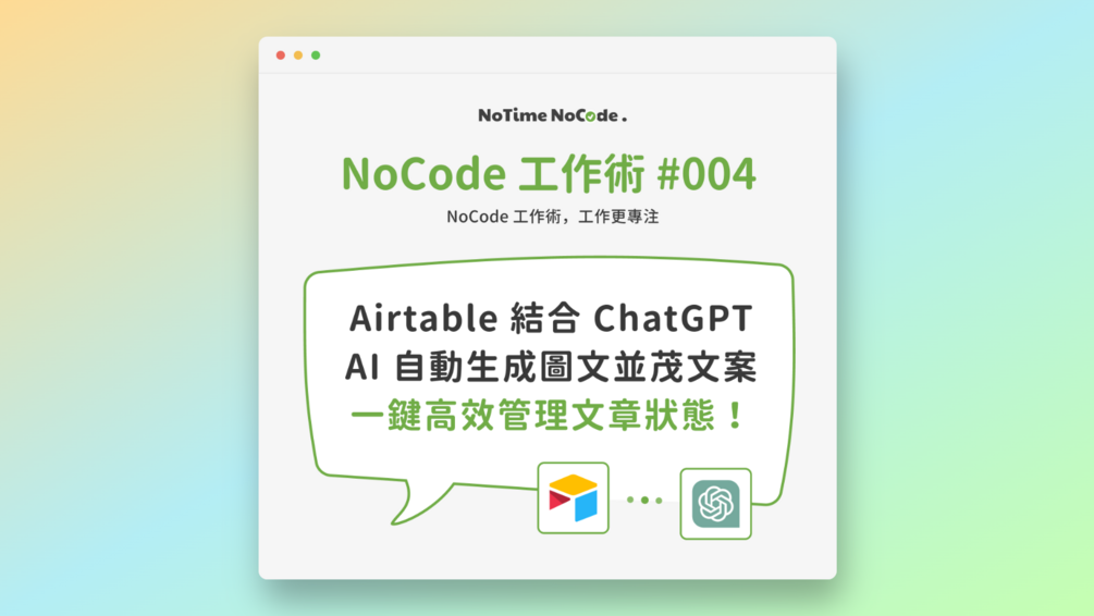 本數位產品為 NoTime NoCode Instagram (@notime_nocode) - NoCode 工作術 #004《Airtable 結合 ChatGPT AI 自動生成圖文並茂文案 一鍵高效管理文章狀態!》篇的進階流程模組範本,如果還沒看過那篇貼文的讀者,歡迎前往我們 IG 貼文查看唷~