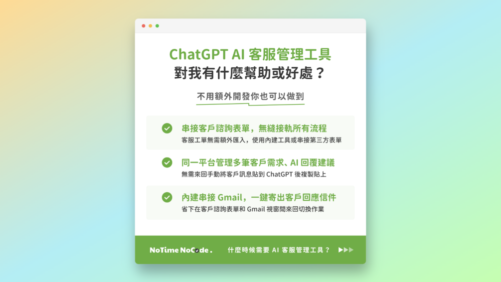 本數位產品為 NoTime NoCode IG (@notime_nocode) - 🔗NoCode 工作術 #007《Airtable 結合 ChatGPT 建立 AI 客服管理工具,大幅縮短客戶回應時間!》篇的進階流程模組範本,如果還沒看過那篇貼文的讀者,歡迎前往我們 🔗IG 貼文查看唷~