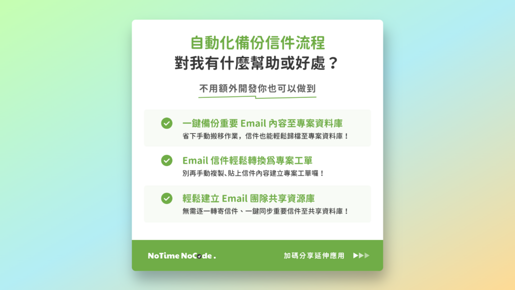 快來認識 NoCode 工作術 — 自動化備份信件流程,幫你把工作流程節省至簡單三步驟: