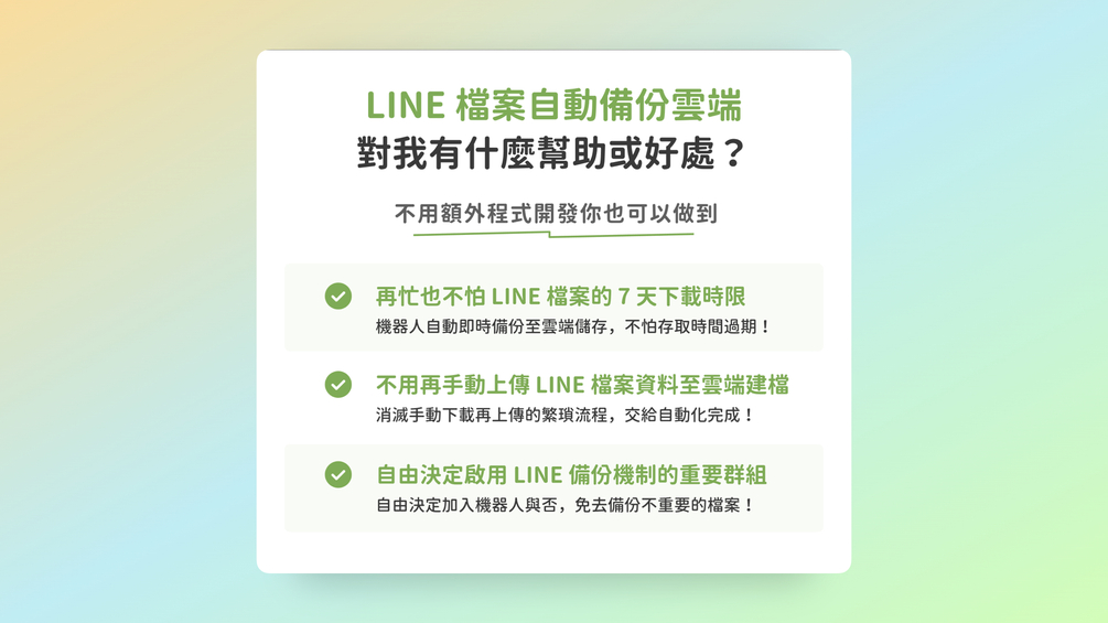 相信大家在工作生活中,時常在 LINE 群組傳送檔案,但收到檔案當下可能正在忙別的事情,忘了先下載檔案,導致超過期限而無法下載?若對方是客戶或上級主管,要麻煩對方再重傳檔案,可能既尷尬又耗時…