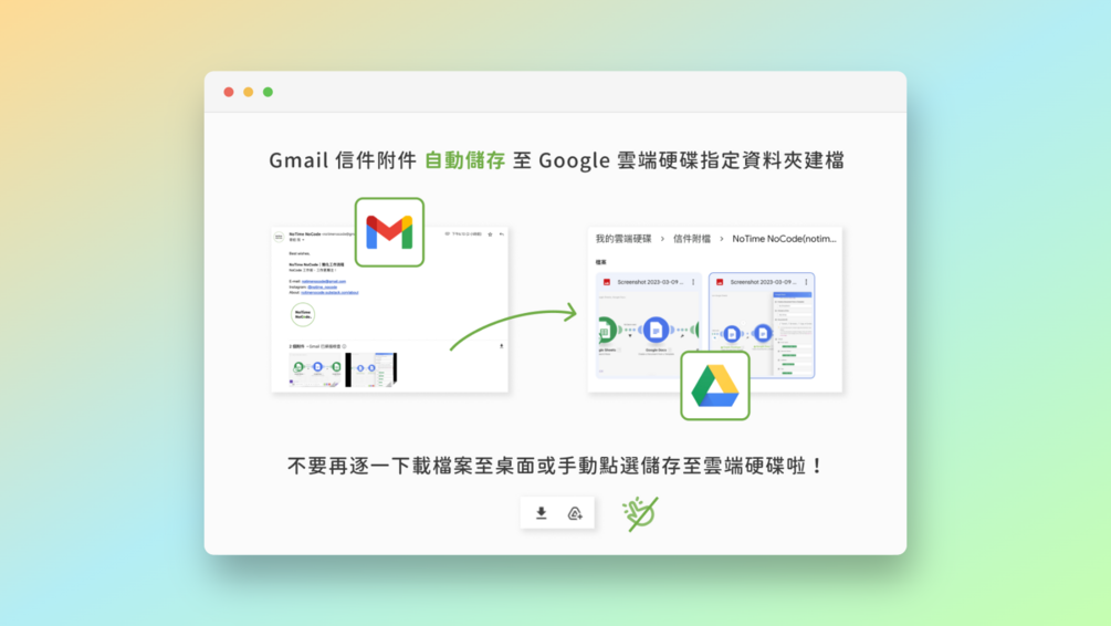本數位產品為 NoTime NoCode IG (@notime_nocode) - NoCode 工作術 #003《自動化下載 Gmail 信箱附件並建檔至 Google 雲端硬碟流程》篇的進階流程模組範本,如果還沒看過那篇貼文的讀者,歡迎前往我們 IG 貼文查看唷~