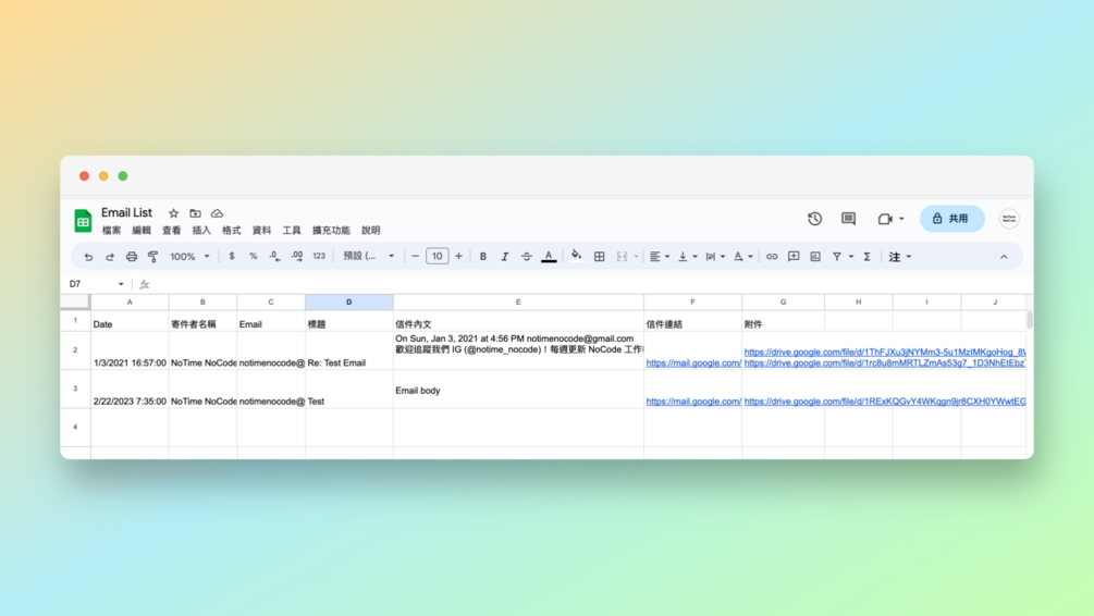 進階流程模組範本除了原有貼文的流程模組外,還額外加碼新增自動建立 Google 雲端硬碟資料夾,以及透過 Google Sheet 作為統整信件總表的「附件連結清單」模組節點應用,除了幫助你自動於收到信件後建立 Google 雲端硬碟資料夾外,也將已於 Google 雲端硬碟建檔的 Gmail 信箱附件轉成連結寫入 Google Sheets,這樣就可以直接在 Google Sheets 中更輕鬆的分類、篩選、總覽、連結所有的信件資訊囉~