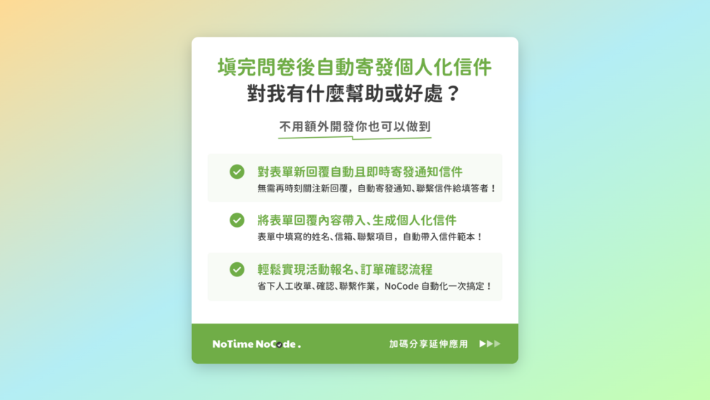 本數位產品為 NoTime NoCode 部落格 - NoCode 工作術 #017《填完 SurveyCake 問卷後,自動帶入填答內容至信件中,寄發個人化信件!》篇的自動化流程模組範本,如果還沒看過那篇文章 / 貼文的讀者,歡迎前往我們部落格 / IG 貼文 / FB 貼文查看唷~
